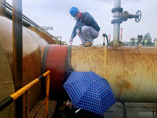設備年修中,員工冒雨檢修管理的漏點,並進行相應補焊