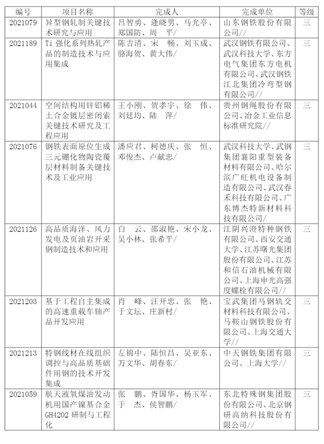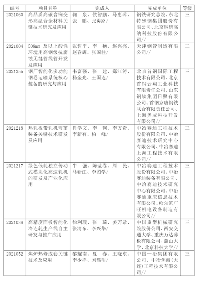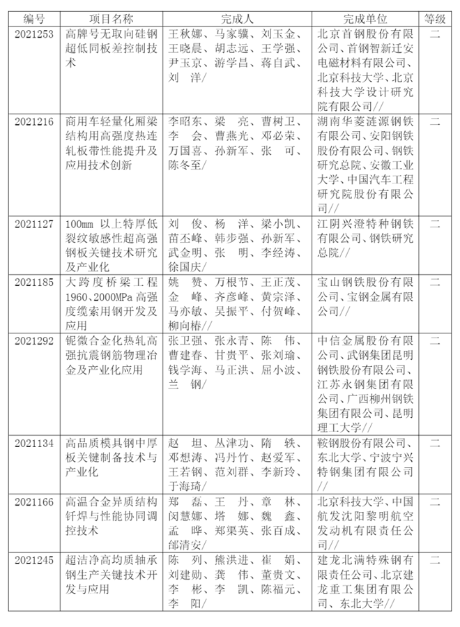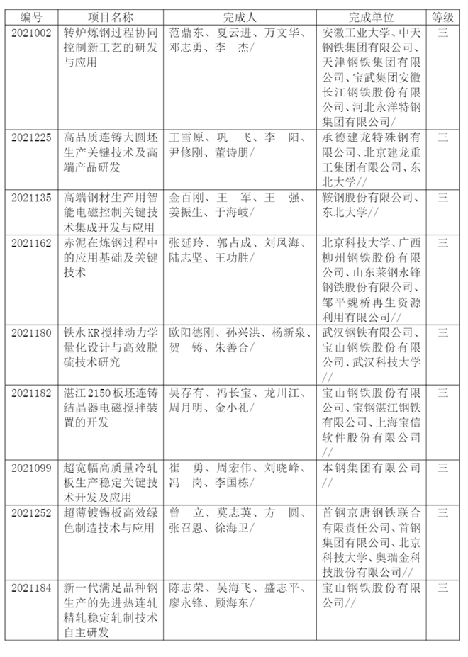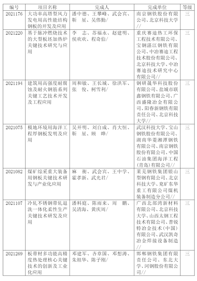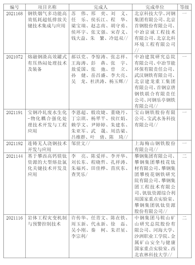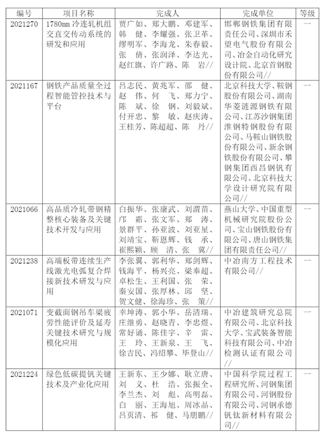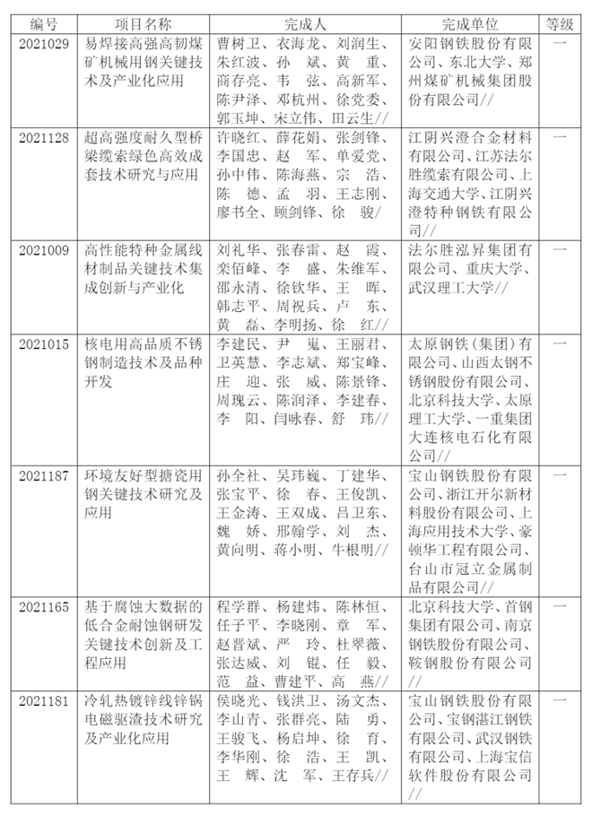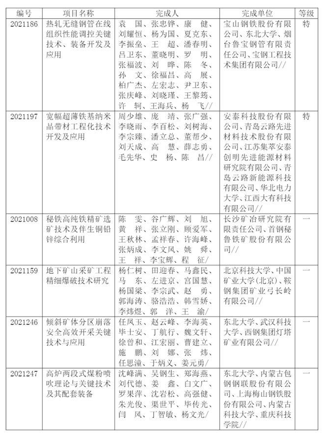 據中國鋼鐵工業協會消息,2021年中國鋼鐵工業協會、中國金屬學會冶金科學技術獎(簡稱”冶金科學技術獎“)專業評審工作已經結束,共推薦獲獎項目115項,其中:特等獎4項,一等獎26項,二等獎26項,三等獎59項。