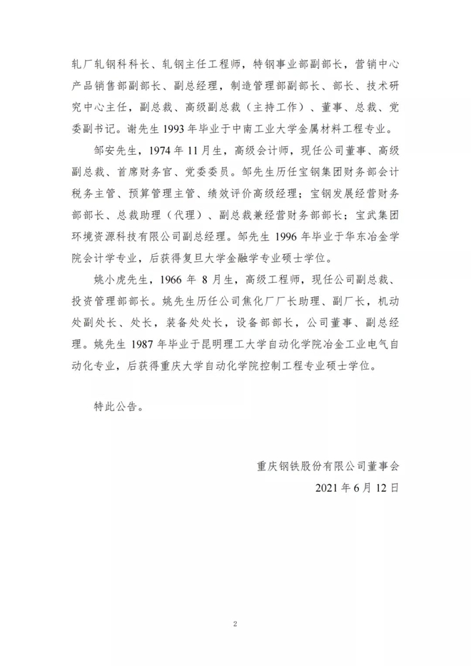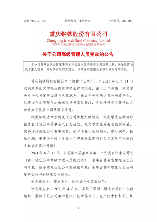6月11日傍晚,重慶鋼鐵發布《關於公司高級管理人員變動的公告》,由(you)於(yu)工(gong)作(zuo)調(tiao)整(zheng),公(gong)司(si)總(zong)裁(cai)張(zhang)文(wen)學(xue)辭(ci)去(qu)重(zhong)慶(qing)鋼(gang)鐵(tie)股(gu)份(fen)有(you)限(xian)公(gong)司(si)總(zong)裁(cai)一(yi)職(zhi),由(you)原(yuan)韶(shao)鋼(gang)鬆(song)山(shan)總(zong)裁(cai)謝(xie)誌(zhi)雄(xiong)擔(dan)任(ren)公(gong)司(si)總(zong)裁(cai)。同(tong)時(shi),董(dong)事(shi)會(hui)聘(pin)任(ren)姚(yao)小(xiao)虎(hu)任(ren)公(gong)司(si)高(gao)級(ji)副(fu)總(zong)裁(cai),鄒(zou)安(an)任(ren)公(gong)司(si)董(dong)事(shi)會(hui)秘(mi)書(shu)和(he)聯(lian)席(xi)公(gong)司(si)秘(mi)書(shu)。