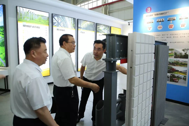 圖為陳玉千一行參觀企業文化展廳裏由天柱牌H型鋼為骨架的裝配式建築節點