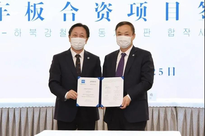 6月25日,河鋼與POSCO(浦項)以視頻會議形式舉行了河鋼—POSCO汽車板合資項目簽約儀式,正式實施年產能達135萬噸的高端汽車麵板項目。