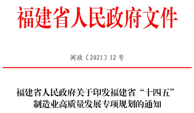 近日,福建省人民政府發布了《福建省人民政府關於印發福建省“十四五”製造業高質量發展專項規劃》(以下簡稱“《規劃》”)。
