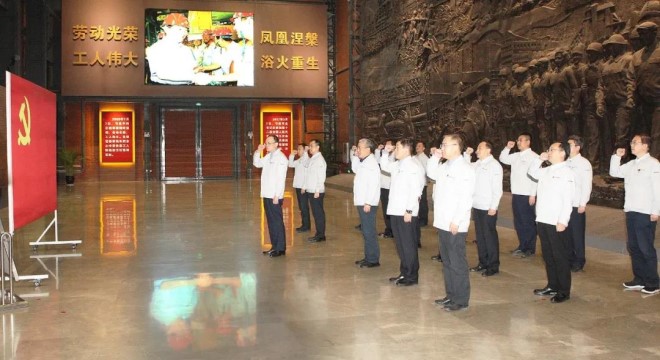 鞍鋼集團黨史學習教育專題讀書班學員到鞍鋼博物館重溫入黨誓詞。
