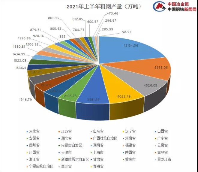 近日,國家統計局公布了2021年上半年31省市自治區粗鋼產量數據。