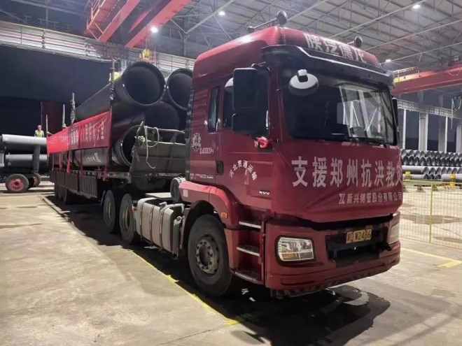 此外,7月22日,新興鑄管鄭州銷售分公司接到鄭州自來水控股有限公司急需應急供水管材任務,立刻開展離心球墨鑄鐵管調配工作,聯係就近生產基地連夜發運所需管材。22日晚21點,鑄管管材從河北武安發運。