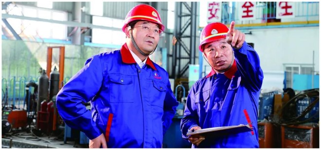 圖為宏興鋼鐵董事長王占宏(左)和副董事長曾昭新在生產一線調研。(苗誌紅 攝)