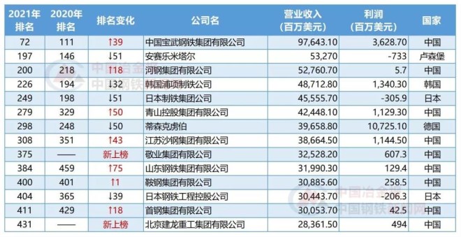8月2日,2021年《財富》世界500強排行榜揭曉。據《中國冶金報》、中國鋼鐵新聞網統計,今年世界範圍內共有14家鋼企入選世界500強,比去年增加2家,北京建龍重工集團、敬業集團為新上榜鋼企;中國寶武鋼鐵集團繼續雄踞世界鋼企榜首,排名比去年上升了39位,並首次進入全球前100強。