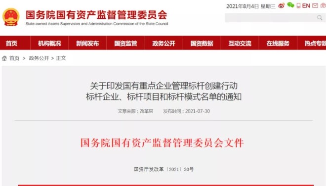 近日,國資委發布了《關於印發國有重點企業管理標杆創建行動標杆企業、標杆項目和標杆模式名單的通知》。按照對標世界一流管理提升行動工作部署,國務院國資委組織國有重點企業認真開展管理標杆企業、標杆項目和標杆模式(以下簡稱“三個標杆”)創建行動。經過企業申報、專家評審、征求意見等環節,現已確定“三個標杆”名單。