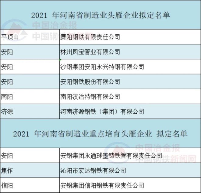 近日,河南省工業與信息化廳官網發布了《2021年河南省製造業頭雁企業擬定名單暨2021年河南省製造業重點培育頭雁企業擬定名單公示》,擬確定80家企業為河南省2021年製造業頭雁企業,89家企業為河南省2021年製造業重點培育頭雁企業,並予以公示。其中,共有6家鋼鐵企業入選頭雁企業擬定名單,3家鋼鐵企業入選重點培育頭雁企業擬定名單。