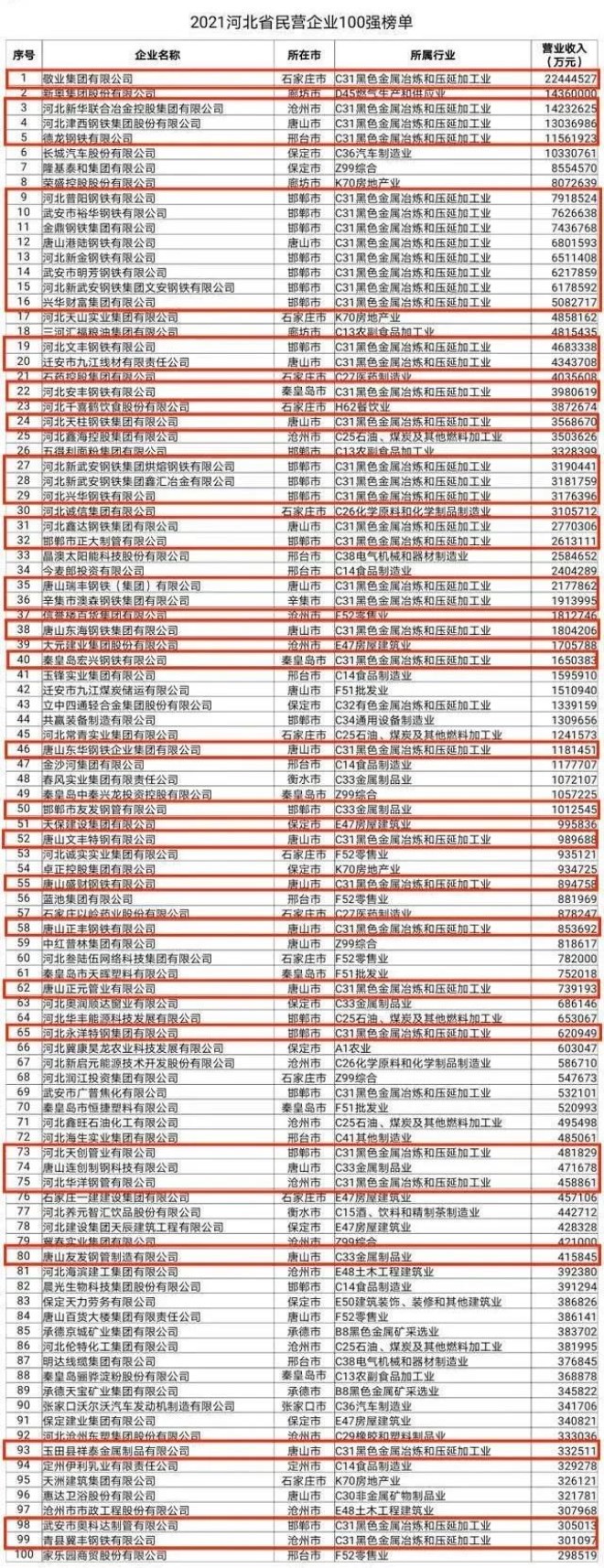 8月11日,河北省工商業聯合會官網發布了2021河北省民營企業100強和2021河北省製造業民營企業100強榜單,39家鋼企上榜河北省民營企業100強,42家鋼企上榜製造業民營企業100強。敬業集團成為河北省第一家營業收入突破2000億元的民營企業,達到2244.45億元,位居民營企業100強榜首和製造業民營企業100強榜首。