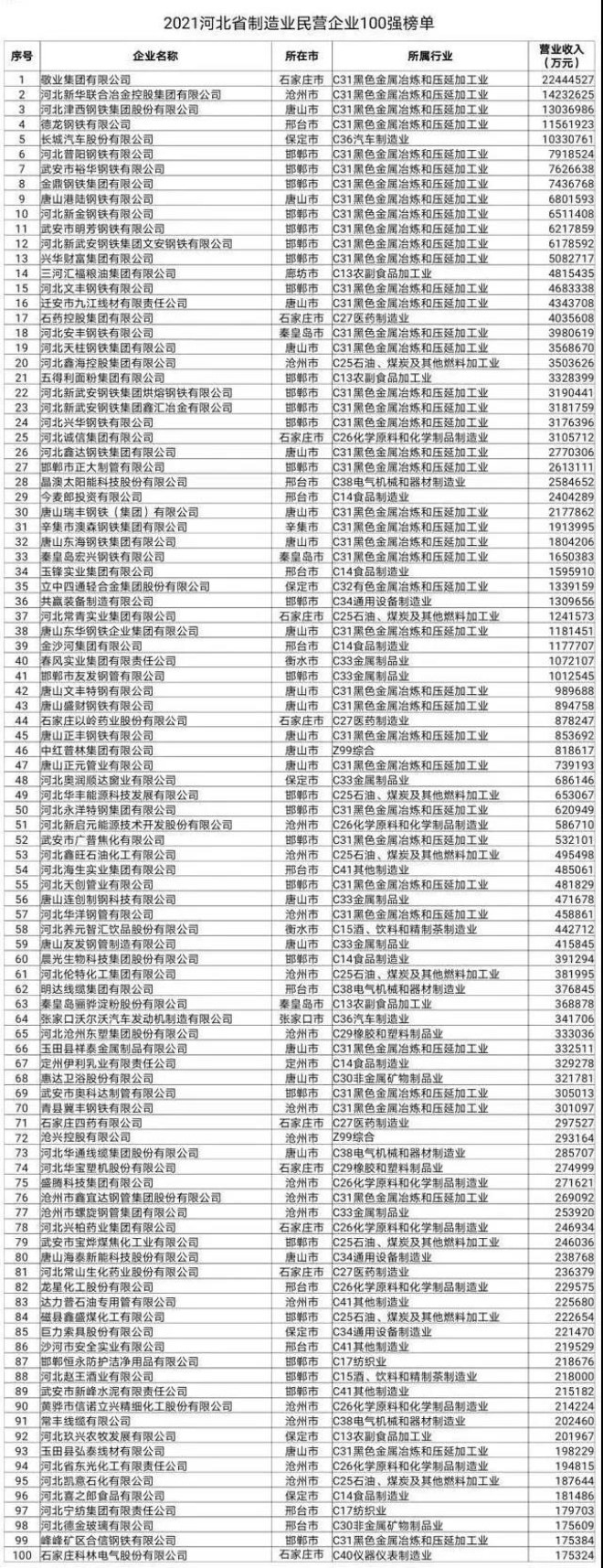 在製造業民營企業100強裏,敬業集團、新華聯合冶金控股集團、津西鋼鐵、德龍鋼鐵、普陽鋼鐵、裕華鋼鐵、金鼎鋼鐵、港陸鋼鐵、新金鋼鐵進入前十強。
