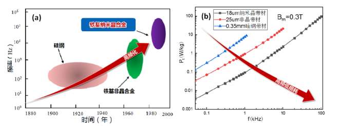 圖2(a)矽鋼/非晶/納米晶合金發展曆程-最佳使用頻率圖