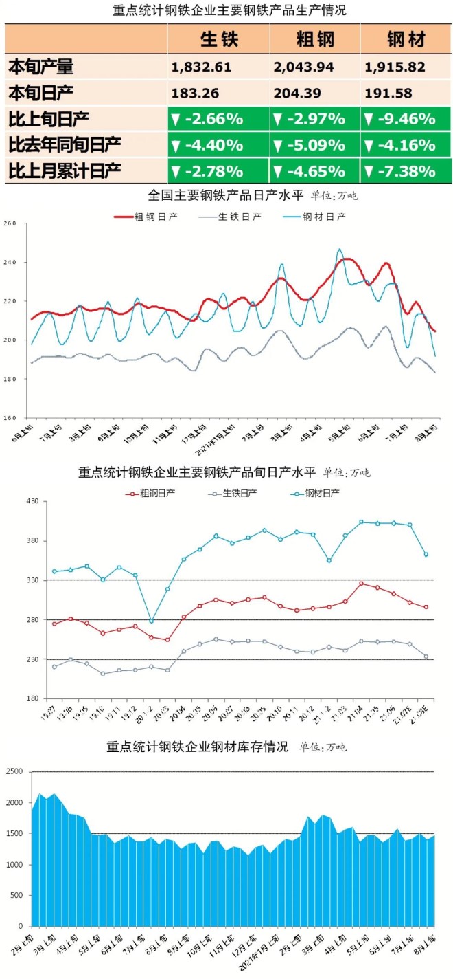 旬度粗鋼日產量環比和同比均繼續下降——8月上旬重點統計鋼鐵企業產、存情況