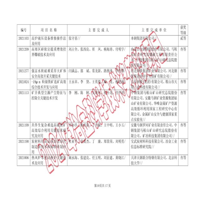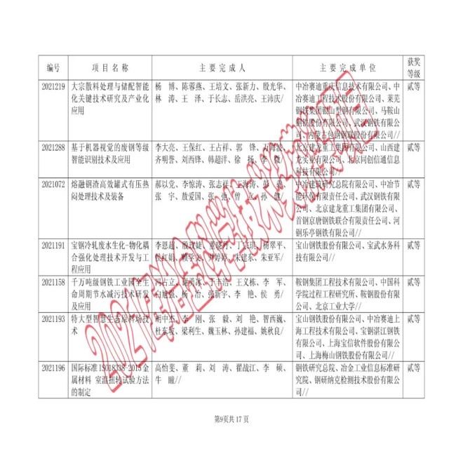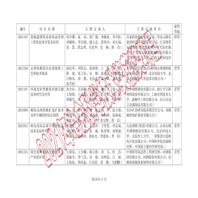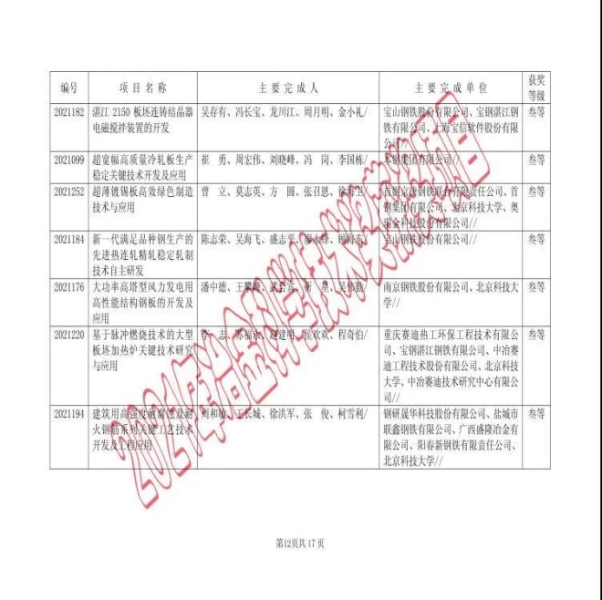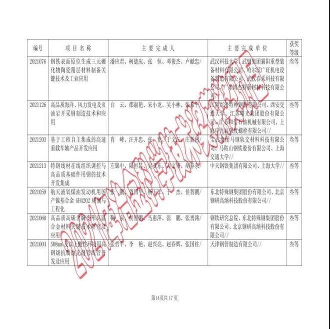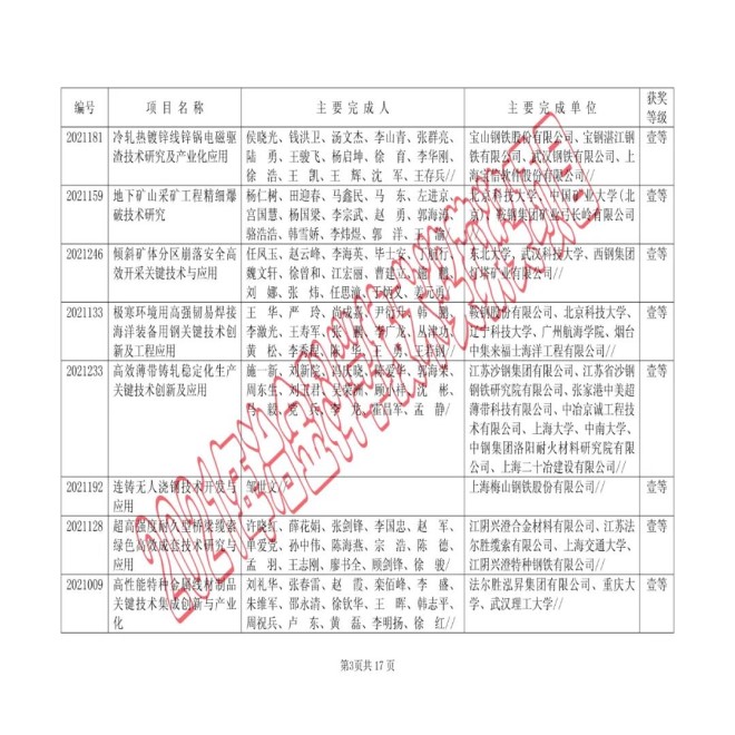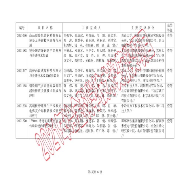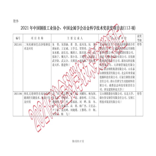 2021年中國鋼鐵工業協會、中國金屬學會冶金科學技術獎獲獎項目表(113項)如下: