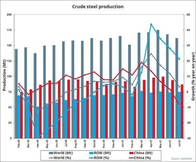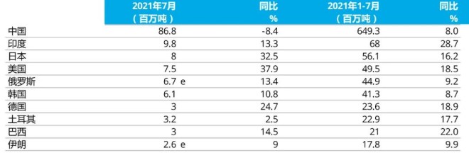 2021年7月全球粗鋼產量同比提高3.3%