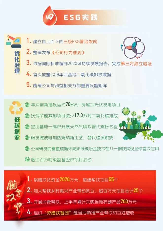 答:圍繞國家“碳達峰、碳中和”目標,當前國家、地區、各行業等各層麵正在研究製定相關政策,中國寶武也已發布碳減排目標,即2023年力爭實現碳達峰,2035年力爭減碳30%,2050年力爭實現碳中和。公司積極響應國家雙碳戰略,成立了碳中和辦公室,統籌推進寶鋼股份綠色低碳領域的科技創新、技術合作、最佳實踐推廣及碳數據、碳資產管理等工作,目前正在逐步構建公司碳排放管理體係,研究編製碳達峰及降碳路線方案。公司已在以下方麵進行了積極探索:八鋼富氫碳循環高爐實驗平台的建設與實驗,八鋼歐冶爐煤氣CO2分離與再利用,湛江100萬噸氫還原豎爐的試驗工程,寶山高爐噴吹天然氣,微波燒結試驗工程,生物質的加工與燃料替代等。公司未來將通過以氫冶金、碳tan循xun環huan為wei代dai表biao的de低di碳tan製zhi造zao,以yi智zhi慧hui製zhi造zao為wei代dai表biao的de效xiao率lv提ti升sheng,以yi產chan品pin性xing能neng提ti升sheng為wei代dai表biao的de綠lv色se產chan品pin使shi用yong等deng,積ji極ji踐jian行xing鋼gang鐵tie行xing業ye綠lv色se低di碳tan轉zhuan型xing,做zuo行xing業ye的de綠lv色se低di碳tan發fa展zhan的de引yin領ling者zhe。