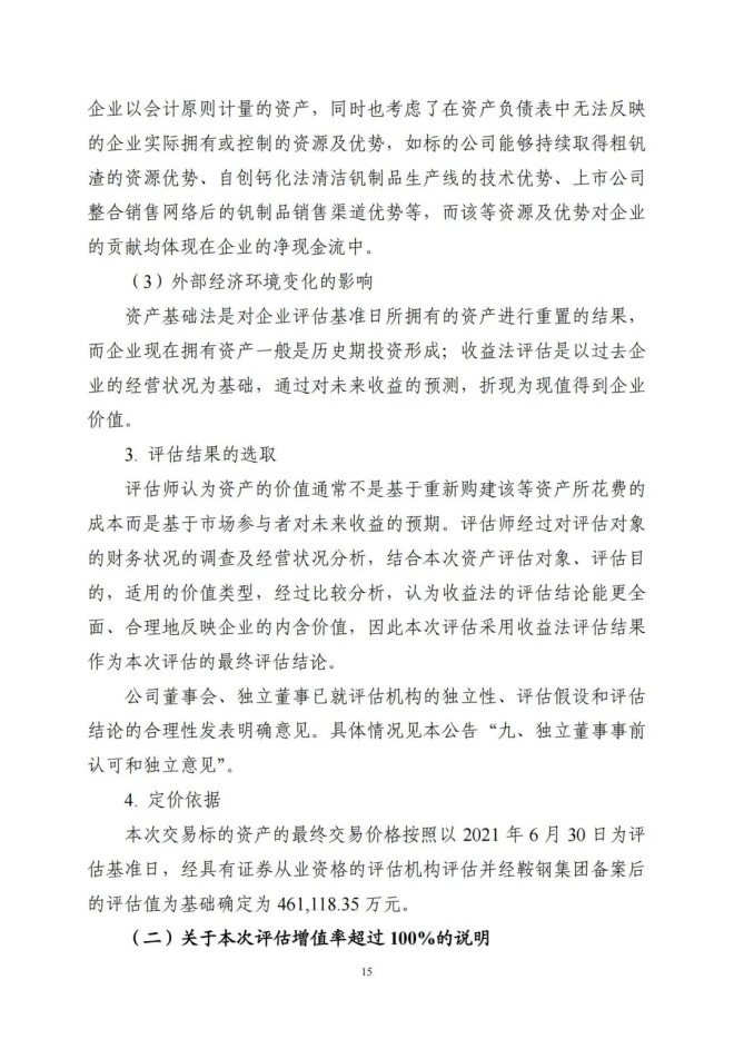 本次交易參考北京天健興業資產評估有限公司出具的《攀鋼集團釩鈦資源股份有限公司擬現金收購攀鋼集團西昌鋼釩有限公司持有的 100%攀鋼集團西昌釩製品科技有限公司股權項目資產評估報告》作為定價依據,經鞍鋼集團有限公司備案,並經交易雙方協商確定標的公司股權轉讓價款為 461118.35 萬元。