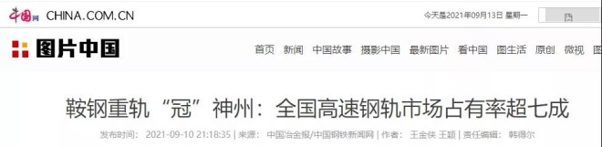 9月10日,中國網刊發了《鞍鋼重軌“冠”神州:全國高速鋼軌市場占有率超七成》一文,體現了對《中國冶金報》的《鋼鐵尋“冠”》係列報道的認可和重視,彰顯了我國鋼鐵企業的品牌地位,為鋼鐵行業高質量發展實現進一步強起來的偉大目標提供範例和有益借鑒。
