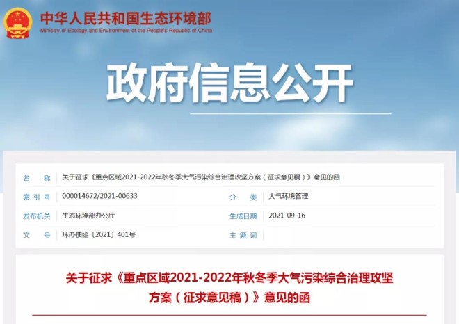 9月16日,生態環境部就《重點區域2021-2022年秋冬季大氣汙染綜合治理攻堅方案(征求意見稿)》征求意見。征求意見稿中提到,主要目標是在秋冬季期間(2021年10月1日至2022年3月31日),各城市完成PM2.5平均濃度和重度及以上汙染天數控製目標。實施範圍考慮到各地秋冬季大氣環境狀況和區域傳輸影響,重點區域秋冬季攻堅範圍在京津冀及周邊地區“2+26”城市和汾渭平原城市基礎上,增加河北北部,山西北部,山東東、南部,河南南部部分城市。