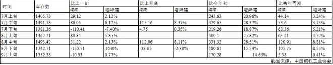 從鋼鐵企業庫存情況來看,今年7月份以來,鋼材庫存總體保持平穩、小幅波動態勢,但庫存水平總體高於去年同期。據鋼協統計,7月上旬,重點統計鋼鐵企業鋼材庫存量1405.73萬噸,比上一旬(即6月底)增加29.12萬噸,增長2.12%;比去年同期增加44.14萬噸,增長3.24%。8月下旬,重點統計鋼鐵企業鋼材庫存量為1342.71萬噸,比上一旬減少150.71萬噸,降低10.09%;比去年同期增加105.75萬噸,增長8.55%。到9月上旬,重點統計鋼鐵企業鋼材庫存量1332.38萬噸,比上一旬減少10.33萬噸,降低0.77%;比年初增加170.28萬噸,增長14.65%;比去年同期增加5.38萬噸,增長0.41%。