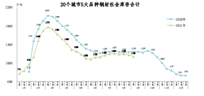 從社會庫存情況來看,7月份以來,鋼材社會庫存基本保持比較平穩態勢。據鋼協統計,7月上旬,20個城市5大品種鋼材社會庫存1166萬噸,環比增加37萬噸,上升3.3%,庫存繼續小幅回升;比年初增加436萬噸,上升59.7%;比去年同期減少82萬噸,下降6.6%。8月下旬,20個城市5大品種鋼材社會庫存為1174萬噸,環比減少18萬噸,下降1.5%;比年初增加444萬噸,上升60.8%;比去年同期減少61萬噸,下降4.9%。到9月上旬,20個城市5大品種鋼材社會庫存1138萬噸,環比減少 36萬噸,下降3.1%,庫存連續下降;比年初增加408萬噸,上升55.9%;比去年同期減少105萬噸,下降8.4%。