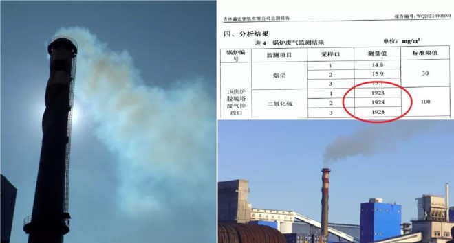圖1 2021年9月1日,督察組現場檢查時,吉林鑫達鋼鐵有限公司煉焦廢氣直排,二氧化硫濃度高達1928毫克/立方米,超標18.3倍