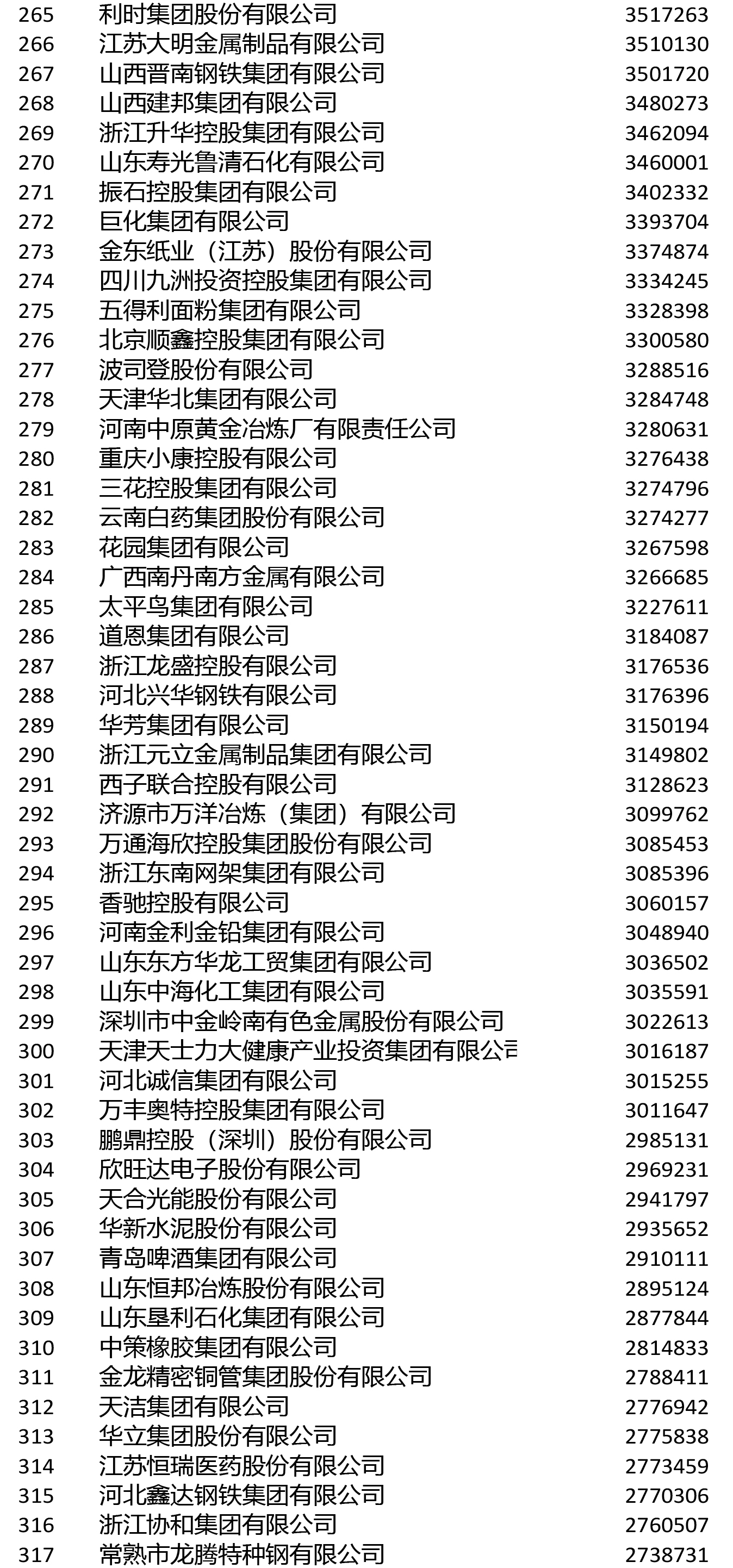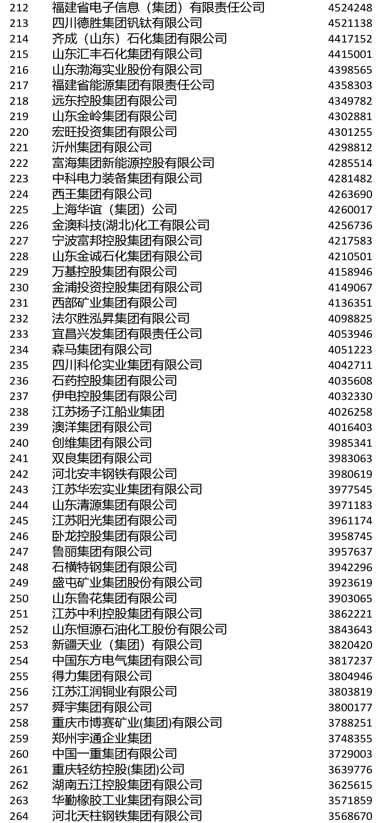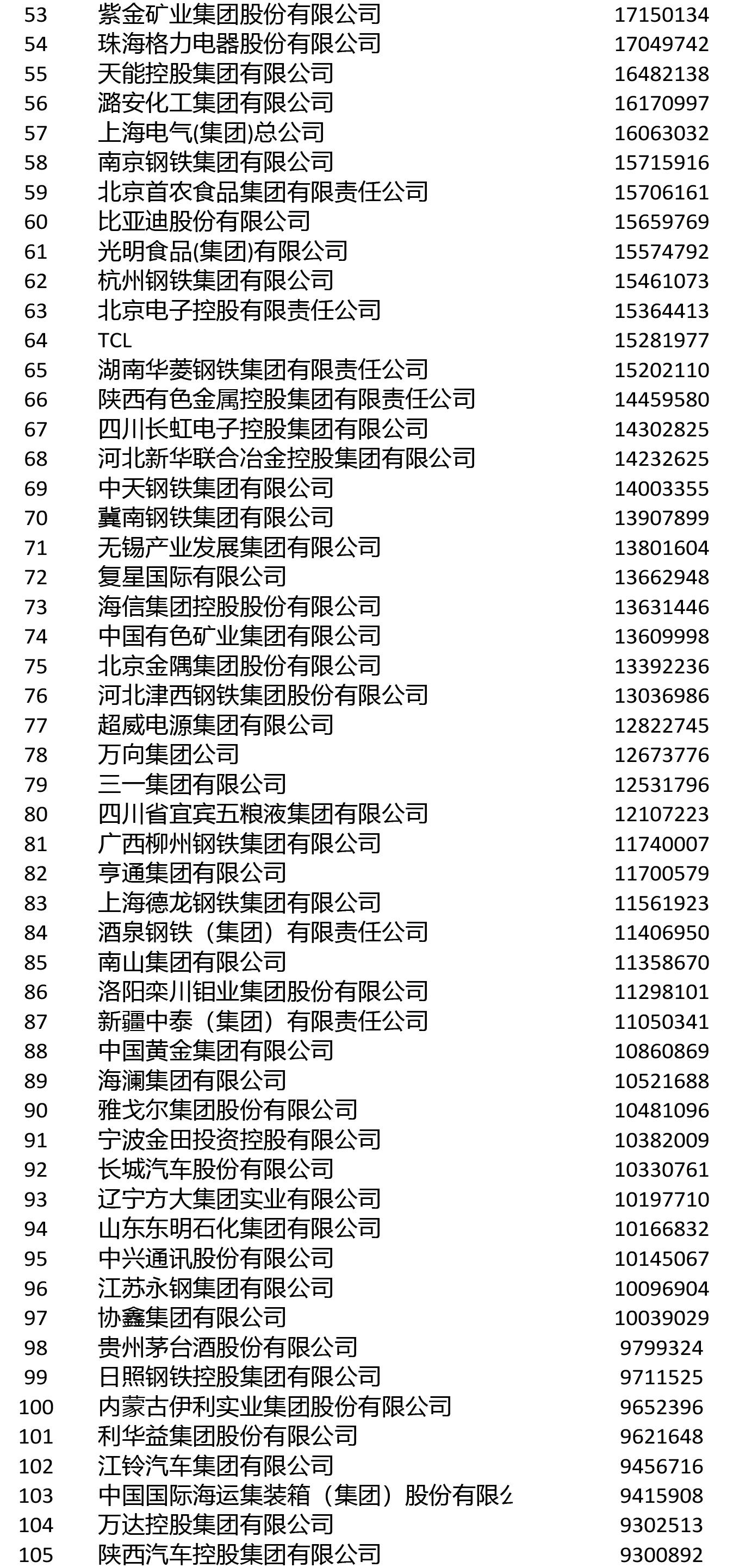 進入前200名的鋼鐵企業還有敬業集團(106)、山鋼集團(108)、鞍鋼集團(111)、首鋼集團(114)、建龍重工(119)、南鋼集團(145)、杭鋼集團(149)、華菱集團(155)、河北新華聯合冶金控股集團(164)、中天鋼鐵(166)、冀南鋼鐵(168)、河北津西鋼鐵(176)、廣西柳鋼集團(191)、上海德龍鋼鐵集團(193)、酒鋼集團(196)。