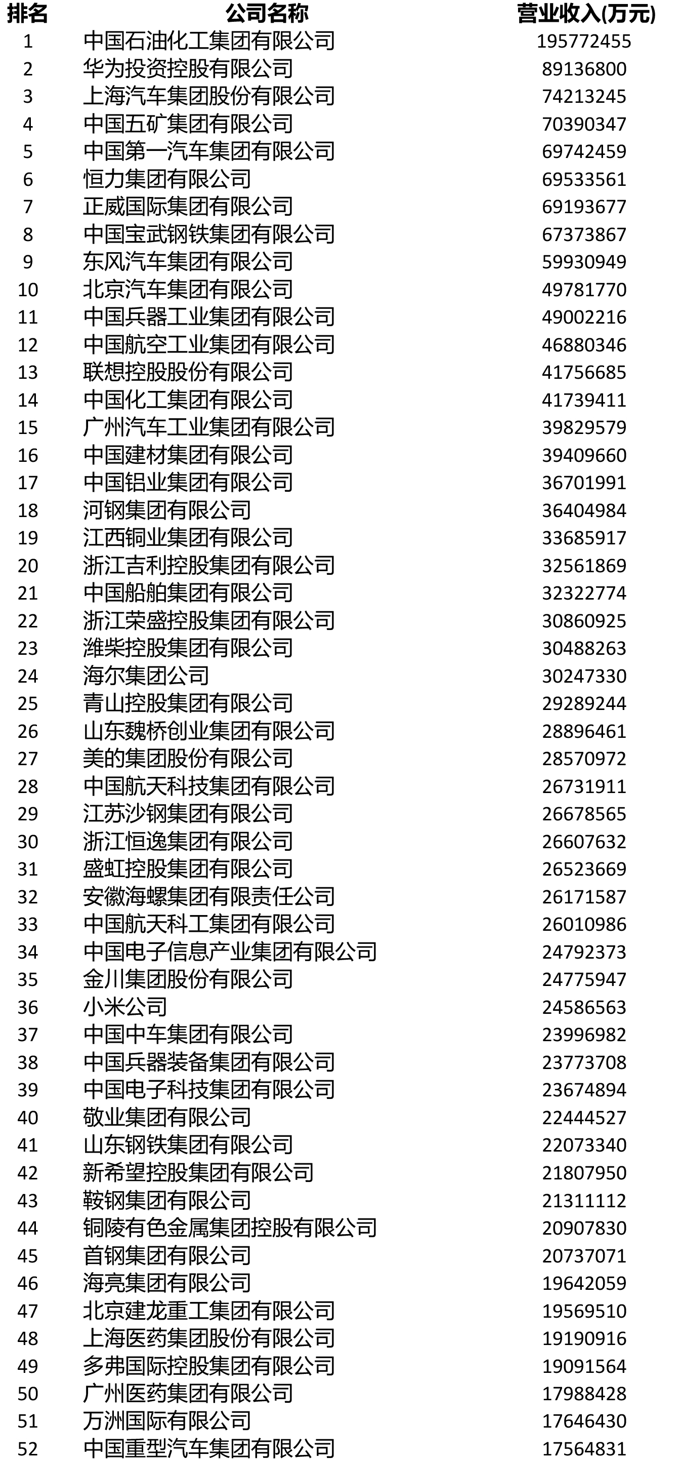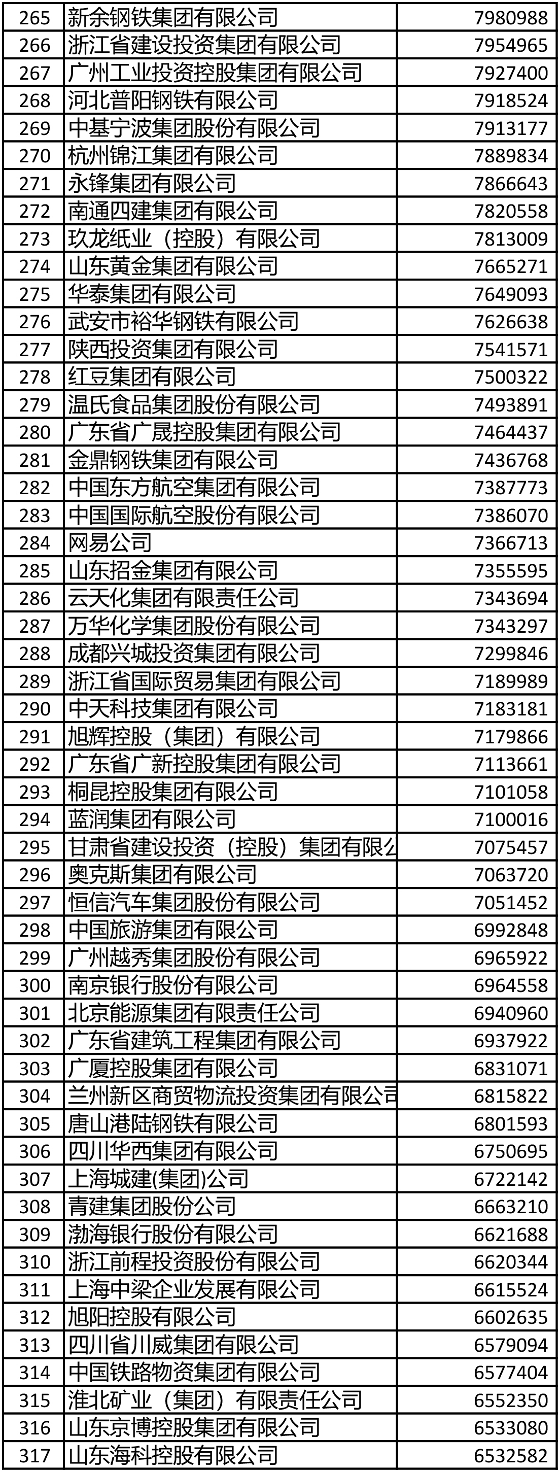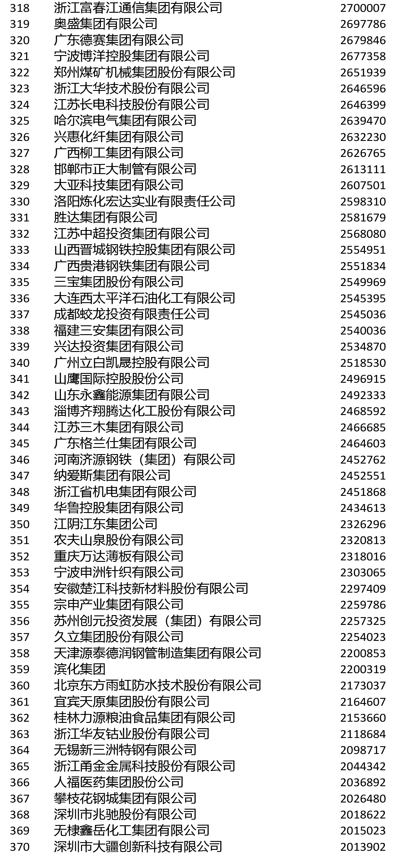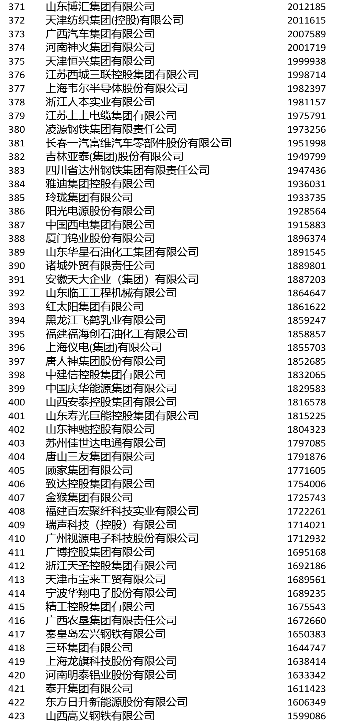 進入前200名的鋼鐵企業還有敬業集團(106)、山鋼集團(108)、鞍鋼集團(111)、首鋼集團(114)、建龍重工(119)、南鋼集團(145)、杭鋼集團(149)、華菱集團(155)、河北新華聯合冶金控股集團(164)、中天鋼鐵(166)、冀南鋼鐵(168)、河北津西鋼鐵(176)、廣西柳鋼集團(191)、上海德龍鋼鐵集團(193)、酒鋼集團(196)。