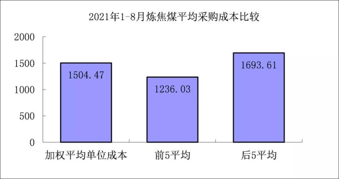 1-8月對標企業煉焦煤平均采購成本最低的前5家企業折算成幹基的加權平均采購成本為1236.03元/噸,比對標企業平均采購成本低268.43元/噸,低於平均采購成本17.84%;而采購成本最高的5家企業的加權平均采購成本為1693.61元/噸,比對標企業平均采購成本高189.14元/噸,高於平均采購成本12.57%。