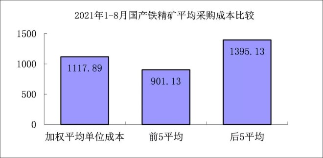 1-8月對標企業國產鐵精礦折算成62%品位的平均采購成本為1117.89元/噸,成本最低的前5家企業的加權平均采購成本為901.13元/噸,比對標企業平均采購成本低216.77元/噸,低於平均采購成本19.39%;而采購成本最高的5家企業的加權平均采購成本為1395.13元/噸,比對標企業平均采購成本高277.23元/噸,高於平均采購成本24.80%。
