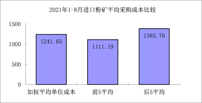 1-8月對標企業進口粉礦折算成62%品位的平均采購成本為1241.65元/噸,成本最低的前5家企業的加權平均采購成本為1111.19元/噸,比對標企業平均采購成本低130.46元/噸,低於平均采購成本10.51%;而采購成本最高的5家企業加權平均采購成本為1385.76元/噸,比對標企業平均采購成本高144.10元/噸,高於平均采購成本11.61%。