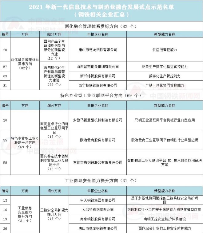 根據《工業和信息化部辦公廳關於組織開展2021年新一代信息技術與製造業融合發展試點示範申報工作的通知》(工信廳信發函〔2021〕87號),經企業自主申報、地方推薦、專家評審等環節,形成了2021年新一代信息技術與製造業融合發展試點示範名單。名單共涉及以下幾家鋼鐵相關企業: