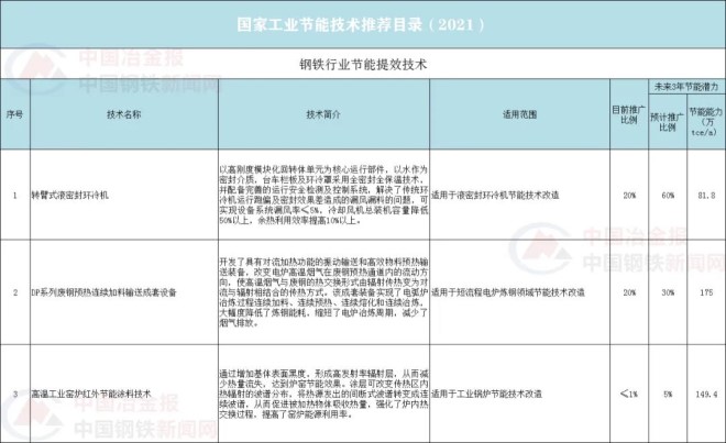 《國家通信業節能技術產品推薦目錄(2021)》中提到了以下鋼鐵行業相關技術: