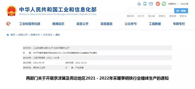 10月13日,工業和信息化部辦公廳、生態環境部辦公廳發布《關於開展京津冀及周邊地區2021-2022年采暖季鋼鐵行業錯峰生產的通知》,實施範圍包括北京、天津、河北、山東、山西等多個省市。