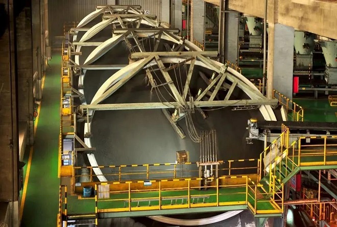 為了推動煉鐵工藝低碳綠色化發展,2015年首鋼規劃京唐公司二期工程,在原煉鐵工藝係統基礎上新建1座5500立方米超大型高爐和2條504平方米大型帶式焙燒機球團生產線,形成“3台504平方米帶焙機+2台500平方米燒結機+3座5500立方米高爐”煉鐵工藝流程配置(即“3+2+3”模式)和以球團礦為主的爐料結構,利用高品質球團礦及工藝能耗低、汙染物排放少等優勢,大幅度降低煉鐵係統的二氧化碳和汙染物排放。該項目高比例球團冶煉模式,實現了3座5500立方米高爐50%球團比例的高效穩定運行。