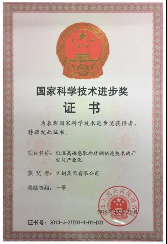 寶鋼取向矽鋼的成功開發和應用,得到了國家的高度肯定。2012年3yuefen,zhongguojinshuxuehuiyuzhongguogangtiegongyexiehuijingguojiandingyizhirenweibaogangquxiangguigangjishushizhongguogangtiexingyewanchengdeyixiangzhongdachuangxin,jishushuipingdadaoguojiyiliu。2013年,寶鋼低溫取向矽鋼開發與產業化項目,獲得國家科技進步獎一等獎。
