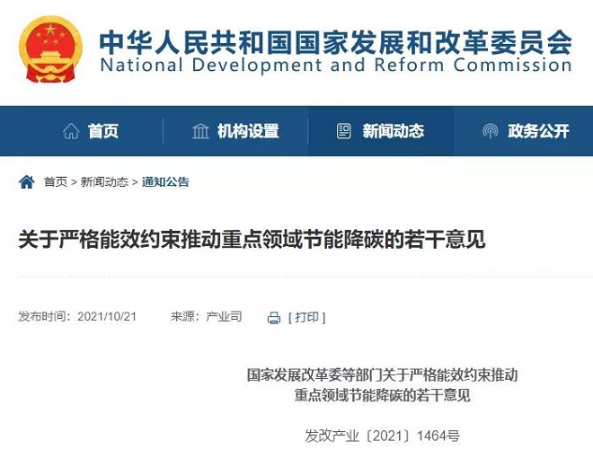 10月21日,國家發展改革委、工業和信息化部、生態環境部、市場監管總局、國家能源局五部門對外發布《關於嚴格能效約束推動重點領域節能降碳的若幹意見》(以下簡稱《意見》),並附上了《冶金、建材重點行業嚴格能效約束推動節能降碳行動方案(2021-2025年)》(以下簡稱《行動方案》),提出到2025 年,通過實施節能降碳行動,鋼鐵、電解鋁、水泥、平板玻璃行業能效達到標杆水平的產能比例超過30%,行業整體能效水平明顯提升,碳排放強度明顯下降,綠色低碳發展能力顯著增強。鼓勵國有企業、骨幹企業發揮引領作用,開展節能降碳示範性改造。改造過程中,在落實產能置換等要求前提下,鼓勵企業實施兼並重組。