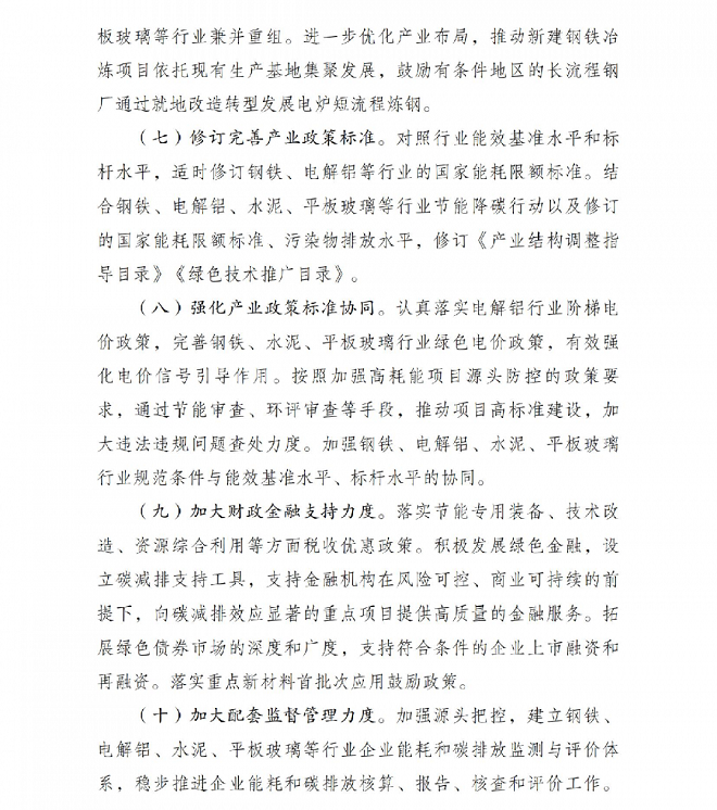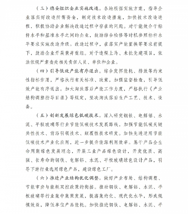 《行動方案》的重點任務包括十個方麵:一(yi)是(shi)建(jian)立(li)技(ji)術(shu)改(gai)造(zao)企(qi)業(ye)清(qing)單(dan),二(er)是(shi)製(zhi)定(ding)技(ji)術(shu)改(gai)造(zao)實(shi)施(shi)方(fang)案(an),三(san)是(shi)穩(wen)妥(tuo)組(zu)織(zhi)企(qi)業(ye)實(shi)施(shi)改(gai)造(zao),四(si)是(shi)引(yin)導(dao)低(di)效(xiao)產(chan)能(neng)有(you)序(xu)退(tui)出(chu),五(wu)是(shi)創(chuang)新(xin)發(fa)展(zhan)綠(lv)色(se)低(di)碳(tan)技(ji)術(shu),六(liu)是(shi)推(tui)進(jin)產(chan)業(ye)結(jie)構(gou)優(you)化(hua)調(tiao)整(zheng),七(qi)是(shi)修(xiu)訂(ding)完(wan)善(shan)產(chan)業(ye)政(zheng)策(ce)標(biao)準(zhun),八(ba)是(shi)強(qiang)化(hua)產(chan)業(ye)政(zheng)策(ce)標(biao)準(zhun)協(xie)同(tong),九(jiu)是(shi)加(jia)大(da)財(cai)政(zheng)金(jin)融(rong)支(zhi)持(chi)力(li)度(du),十(shi)是(shi)加(jia)大(da)配(pei)套(tao)監(jian)督(du)管(guan)理(li)力(li)度(du)。
