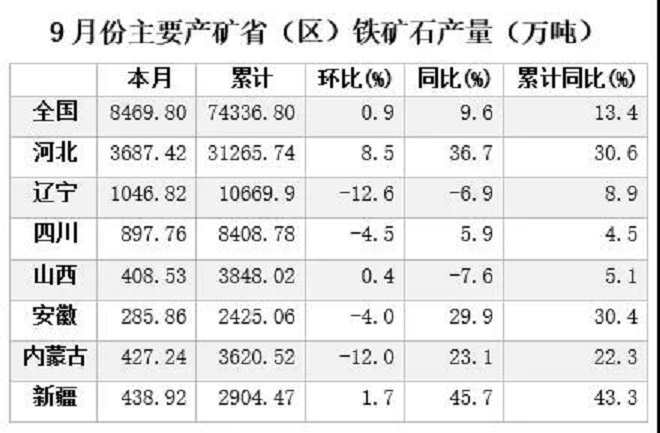 9月份,在安全環保管控從嚴、能耗“雙控”電力供應緊張大背景下,全國鐵礦石產量整體保持增長態勢。據國家統計局數據顯示,9月份全國鐵礦石原礦產量8469.8萬噸,較上月增加78.3萬噸,環比增長0.9%,同比增長9.6%。1月-9月份累計鐵礦石產量為74336.8萬噸,同比增長13.4%。