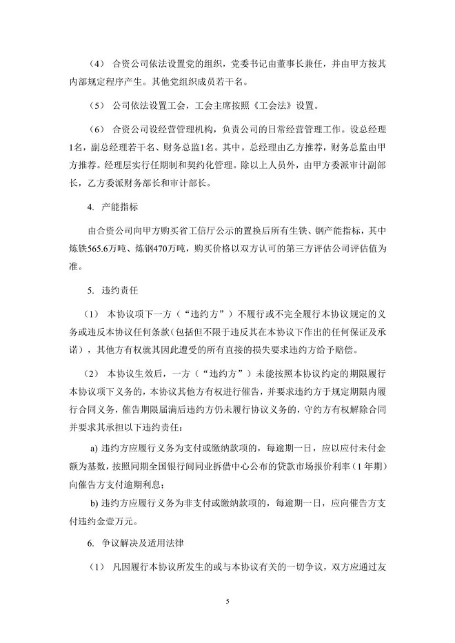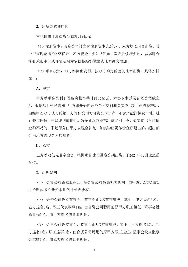 經協商,雙方確定合資公司持股比例為:河鋼股份持股51%,河北能嘉持股49%。合資公司初期注冊資本為5億元,按照約定的持股比例,河鋼股份以現金出資2.55億元,河北能嘉以現金出資2.45億元。合資公司最終注冊資本在項目建成後根據雙方實際投入,按照河鋼股份持股51%、河北能嘉持股49%的比例另行確定。