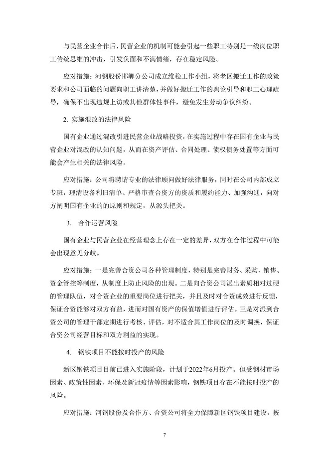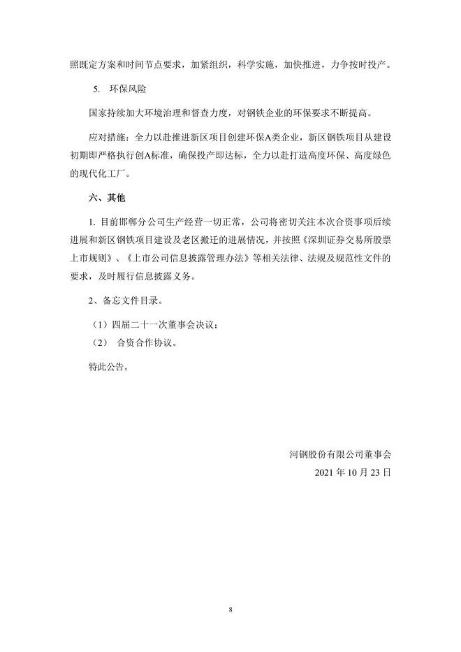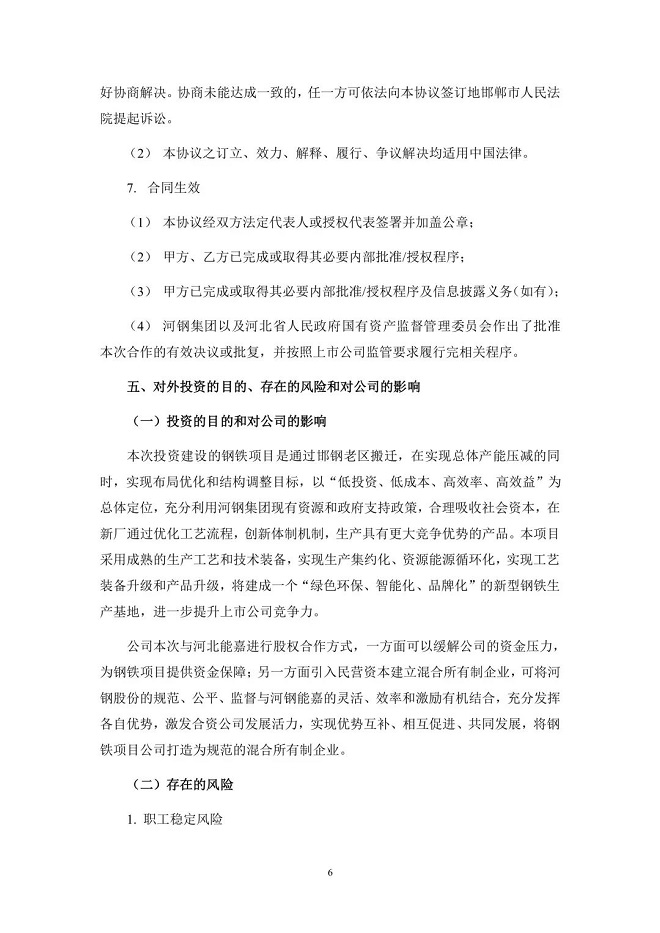 由公告可知:河鋼股份邯鄲分公司老區將實施退城搬遷,在邯鄲市涉縣建設新基地。為全力做好老區搬遷和新區建設工作,該公司經過多方比選,決定與河北能嘉投資有限公司(以下簡稱“河北能嘉”)聯合組建鋼鐵項目公司,共同實施新區鋼鐵項目建設和運營。