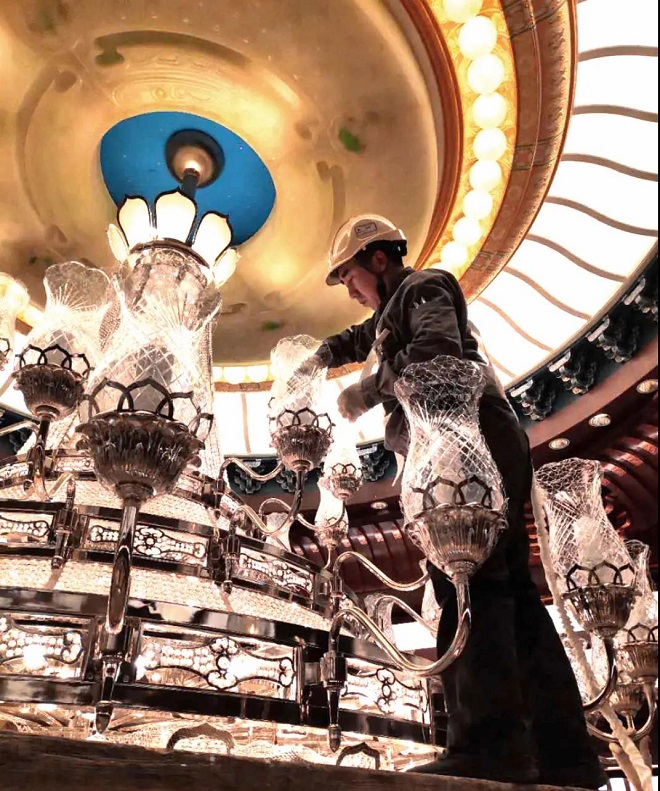圖為張宣高科機電公司維保人員正在對“一帶一路”國際合作峰會主會場吊燈進行維護。