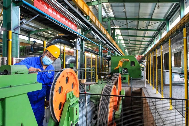 圖為張宣高科金屬製品公司職工正在查看鋼絞線產品質量。
