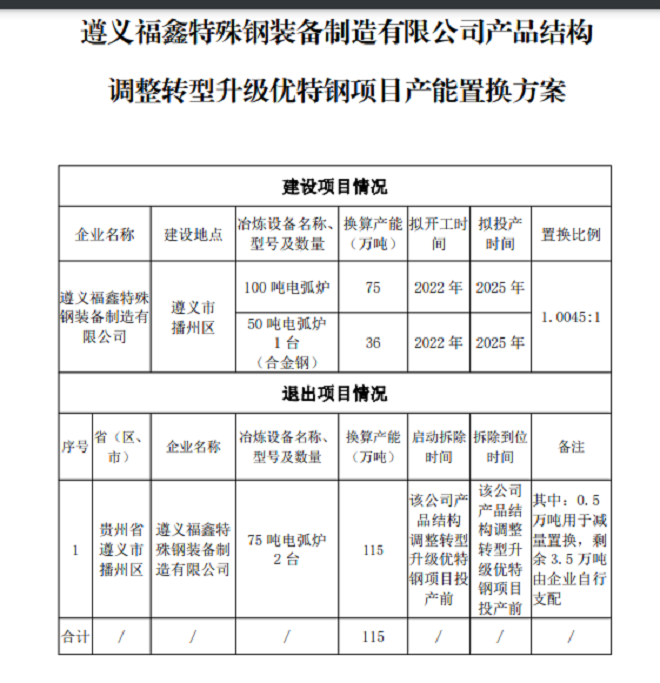 04遵義福鑫特殊鋼裝備製造有限公司產品結構調整轉型升級優特鋼項目產能置換方案