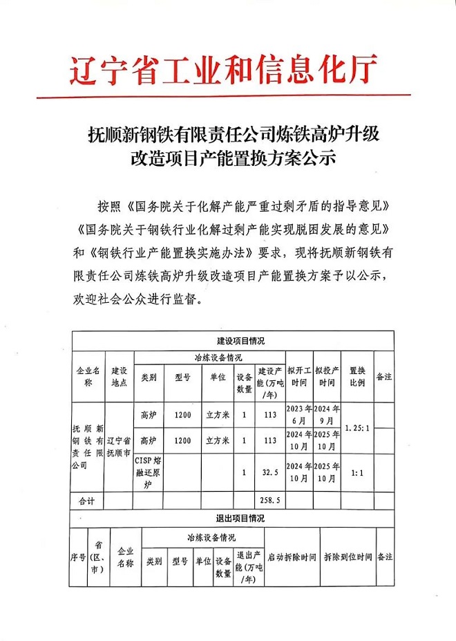 10月28日,遼寧省工信廳發布撫順新鋼鐵有限責任公司煉鐵高爐升級改造項目產能置換方案公示,其中,撫順新鋼鐵擬開工新建1200立方米高爐2座、CIP熔融還原爐1座,合計產能258.5萬噸。