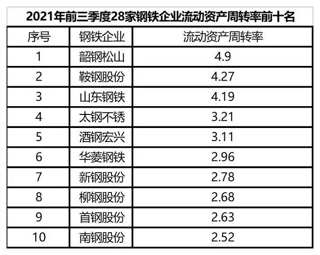 2021年前三季度,27家鋼鐵企業(八一鋼鐵未公布)實現營業總收入合計17502.59億元,相較2020年前三季度同口徑11570.39億元,增長51.27%;27家鋼鐵企業(八一鋼鐵未公布)實現營業總成本合計16179.89億元,相較2020年前三季度同口徑11085.03億元,增長45.96%。2021年前三季度,28家鋼鐵企業利潤總額1403.68億元,相較2020年同期531.92億元增長1.64倍。下麵從營運能力、償債能力、盈利能力和發展能力四個方麵進行分析。