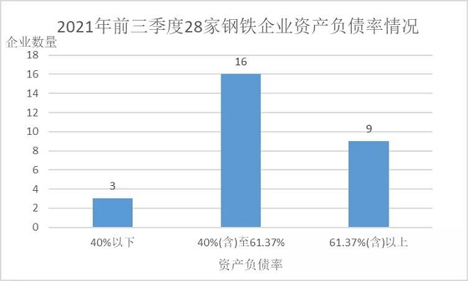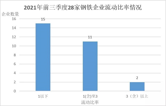 (二)償債能力穩步提升。從資產負債率看,2021年前三季度28家鋼鐵企業平均資產負債率為56.62%,比2020年同期下降0.82個百分點。據中國鋼鐵工業協會數據,截至今年9月末全國重點大中型鋼鐵企業資產負債率61.37%,28家鋼鐵企業的平均負債情況好於全國重點大中型鋼鐵企業平均水平,其中有19家企業資產負債率低於61.37%,有5家企業的資產負債率超過70%;從有息負債率看,2021年前三季度28家鋼鐵企業平均有息負債率為17.5%,比2020年同期下降2.57個百分點,反映出近兩年28家鋼鐵企業效益向好,對金融機構的信貸需求有所下降。
