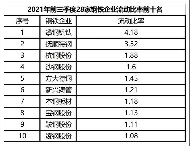 從流動比率看,2021年前三季度28家鋼鐵企業的平均流動比率為0.87,較2020年同期增加0.07,盡管流動比率同比有些許改善,但仍然較低。在“碳達峰碳中和”大背景下,節能降耗、環保超低排放等標準的嚴格實施促使鋼鐵企業加大工藝設備改造力度,資金用於固定資產投資較多,導致流動比率不高,反映出28家鋼鐵企業的短期償債能力較弱。整體來看,流動比率大於1的有13家鋼鐵企業,流動比率最高的是攀鋼釩鈦,達到4.18。