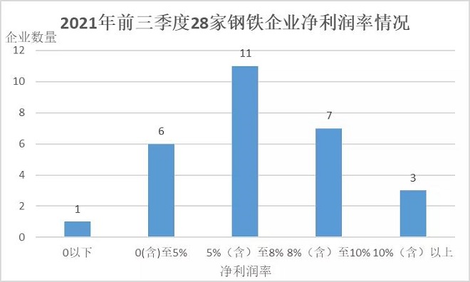 (三)盈利能力保持高位。從利潤率看,2021年前三季度28家鋼鐵企業平均毛利率、淨利潤率、成本費用利潤率分別為12.87%、6.55%、8.76%,較2020年同期分別增長2.03、2.89、3.93個百分點,較2021年上半年分別下降0.73、0.53、0.62個百分點。截至2021年三季度末,28家鋼鐵企業中有27家實現盈利,僅西寧特鋼1家企業虧損。去年同期28家鋼鐵企業全部實現盈利。