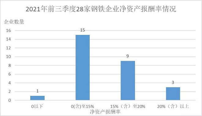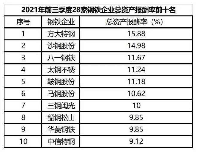 從資產報酬率看,2021年前三季度28家鋼鐵企業平均總資產報酬率為7.61%、淨資產報酬率為13.61%,較2020年前三季度分別增加3.95和7.76個百分點,較2021年上半年分別增加2.24和3.82個百分點,反映出鋼鐵企業盈利能力進一步增強。在28家鋼鐵企業中,分別有27家鋼鐵企業總資產報酬率、淨資產報酬率實現同比正增長,其中華菱鋼鐵總資產報酬率同比下降,西寧特鋼淨資產報酬率同比下降。